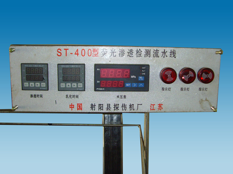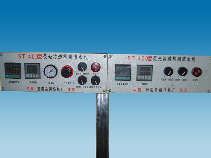滲透檢驗是將一種含有熒光物質的滲透劑涂覆在零件表面上,在毛細作用下,滲透劑滲入表面的缺陷中去,然后去除掉零件表面上多余的滲透劑,再在零件表面涂上一薄層顯像劑,缺陷中的滲透劑在毛細作用下重新被吸附到零件表面上來而形成放大了的缺陷顯示,在黑光燈下(熒光檢驗法)觀察缺陷顯示。滲透檢驗的基本步驟是滲透,乳化,清洗,干燥,顯像和檢驗。設計制造依據(jù)及檢驗標準:按HB/Z61-98《滲透檢驗》標準,按GE公司工藝規(guī)范,美國ASTME165,ASTME1417《滲透檢驗》標準、GB2617-92《試驗機通用技術要求》標準。該線主要有實用、耐用、高效、穩(wěn)定可靠等優(yōu)點。熒光滲透探傷流水線主要包含以下幾個工藝流程:前清洗 …… 滲透 …… 乳化 …… 清洗 …… 干燥 …… 顯像 …… 觀察檢驗。